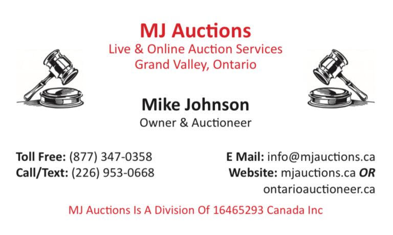 MJ Auctions Michael JohnsonT – 226-953-0668E – mike@mjauctions.caW – mjauctions.caLive & Online Auction ServicesGrand Valley, ONL9W